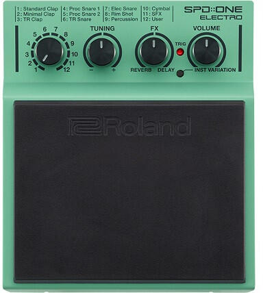 A Roland SPD::ONE ELECTRO egy új digitális Percussion pad, amely minden zenész számára lehetővé teszi különböző elektronikus dob hangzások hozzáadását az előadásukhoz. Összesen 22 ikonikus hangszín érhető el, beleértve az erőteljes 808 lábdobokat, kövér pergőket, átütő tapsokat, elektronikus kolomp hangszíneket és sok mást, de saját audió hangzások importálására is lehetőség kínálkozik a USER hangszín bankba. Az SPD::ONE ELECTRO egy strapabíró, mégis érzékeny pad, amely dobverővel, kézzel, de akár lábbal is megszólaltatható, a trigger érzékenység beállítások elvégzése pedig egyszerűen kezelhető vezérlőkkel történik. A könnyen hordozható SPD::ONE ELECTRO működtethető elemekkel vagy AC adapterrel, elhelyezhető a padlón vagy asztalon, de használható bármilyen hangszer összeállítás vagy dob szett részeként is a tartozék rögzítő bilinccsel. Kezelése semmilyen technikai felkészültséget nem igényel, a hangerő, hangszín és arányok beállítása mindössze négy potméterrel elvégezhető a vezérlő panelen. Dobosok, ütőhangszeresek, gitárosok, DJ-k vagy énekesek számára az SPD::ONE ELECTRO egyszerű és rugalmas megoldást kínál a hangpaletta kibővítéséhez és ezáltal az előadás gazdagításához.